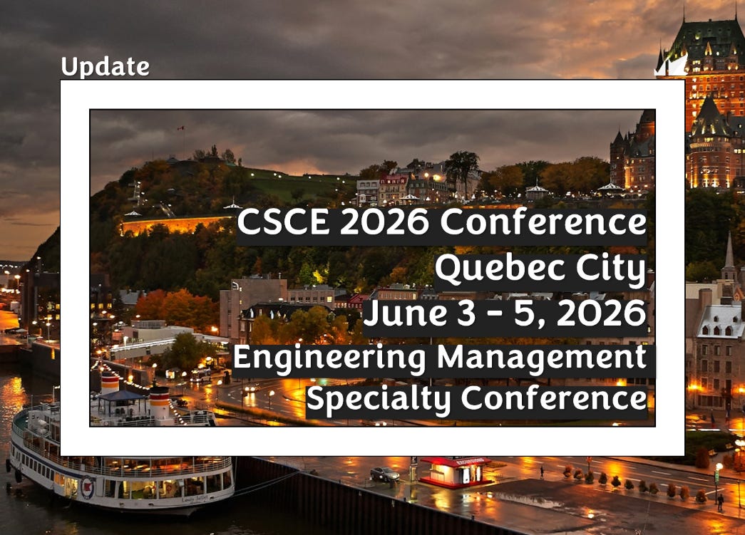 As we move into a new academic year, I am delighted to share an update on one of our field’s most important gatherings: the Engineering Management Specialty Conference at the Canadian Society for Civil Engineering (CSCE) 2026 Annual Conference, to be held in Québec City, June 3–5, 2026.